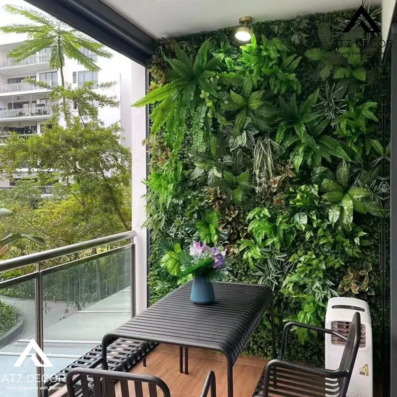 + Nếu bạn muốn “khoanh vùng” phần ban công như khu thư giãn, làm backdrop ảnh, hoặc tạo điểm nhấn trang trí rồi ít muốn phải chăm cây hàng ngày thì tường cây giả giúp.